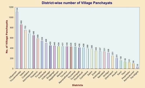 There are 12,620 Village Panchayats in the State spread across the 30 districts and the 385 Blocks. The average number of Village Panchayats per district is 421 and per Block is 32. The Nilgiris (35), Kanniyakumari (99), Theni (130) and Karur (158) are some of the districts with fewer Village Panchayats while Villupuram (1104), Tiruvannamalai (860), Vellore (753), Cuddalore (683) and Kancheepuram (648) are some of the districts with a large number of Village Panchayats. As can be seen from Table 5, the population of Village Panchayats in Tamil Nadu is widely varying with some Village Panchayats having populations even below 500 while others have populations exceeding 25,000.